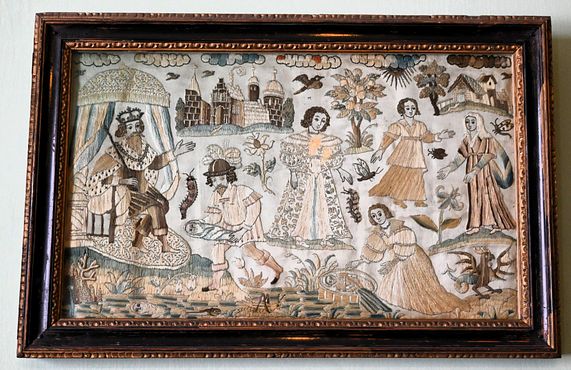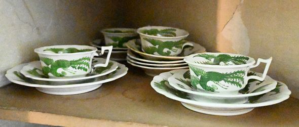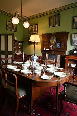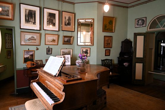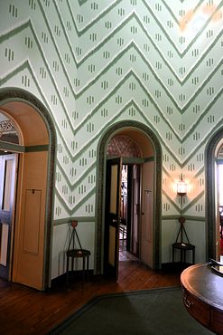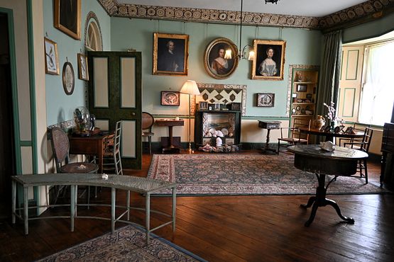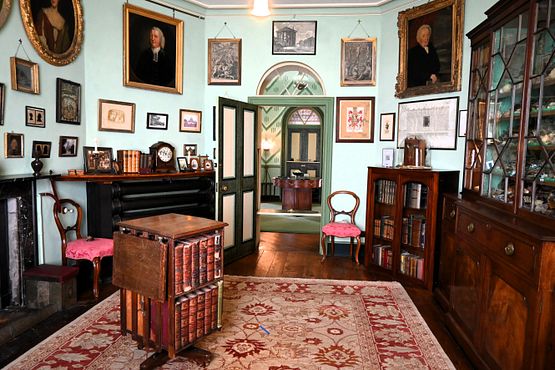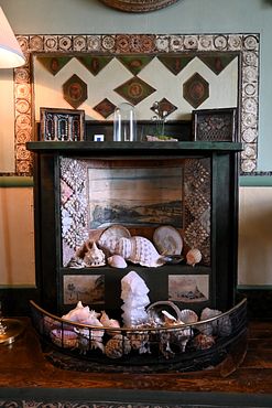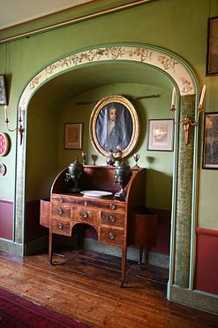 The house was completed in about 1796, and designed to be 16 sided, by 2 female cousins when they returned from their Grand Tour. They were great artistes, and the whole ceiling is a shell gallery, now too delicate to visit. One of the rooms has a feather frieze.